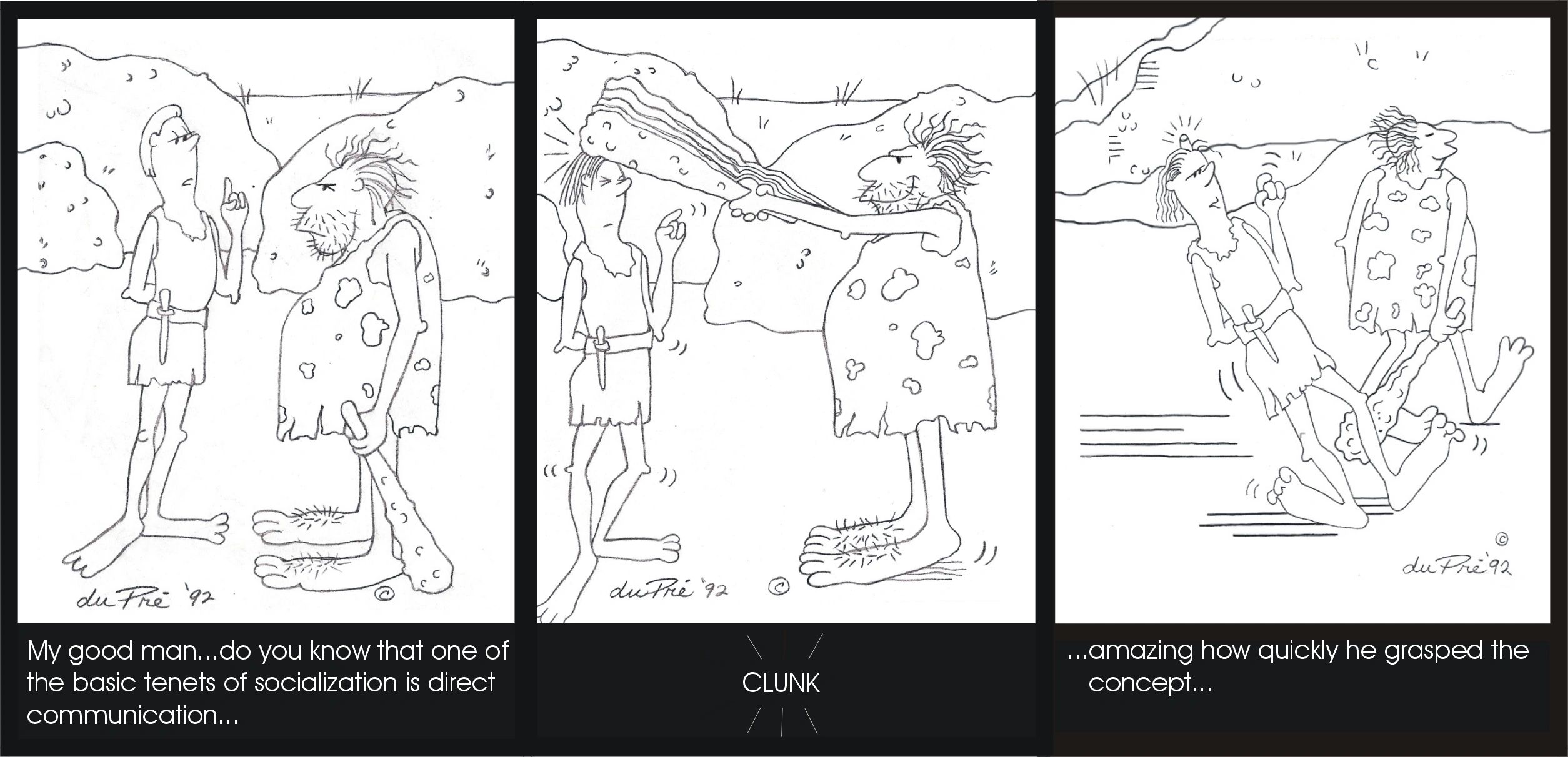 Frame ( 1 ) Caption: My good man...did you know that the basic tenant of communication is direct contact? Frame ( 2 ) Caption: Clunk... Frame ( 3 ) Caption: It's amazing how quickly he grasped that concept...